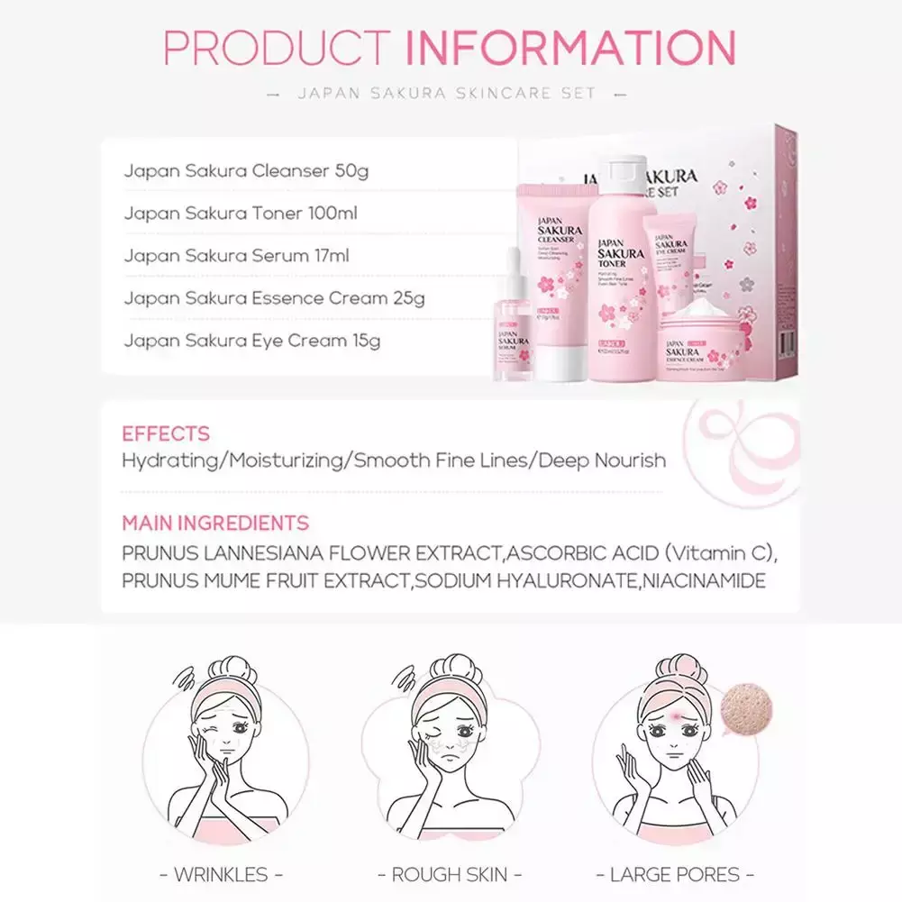 Limpe e nutra a pele: Os produtos de higiene e os fatos de viagem são infundidos com extrato de cerejeira. Limpe o rosto com o limpador de flor de cerejeira primeiro e depois hidrate a pele seca com essência de flor de cerejeira, creme e toner para fazer você brilhar mais saudável.